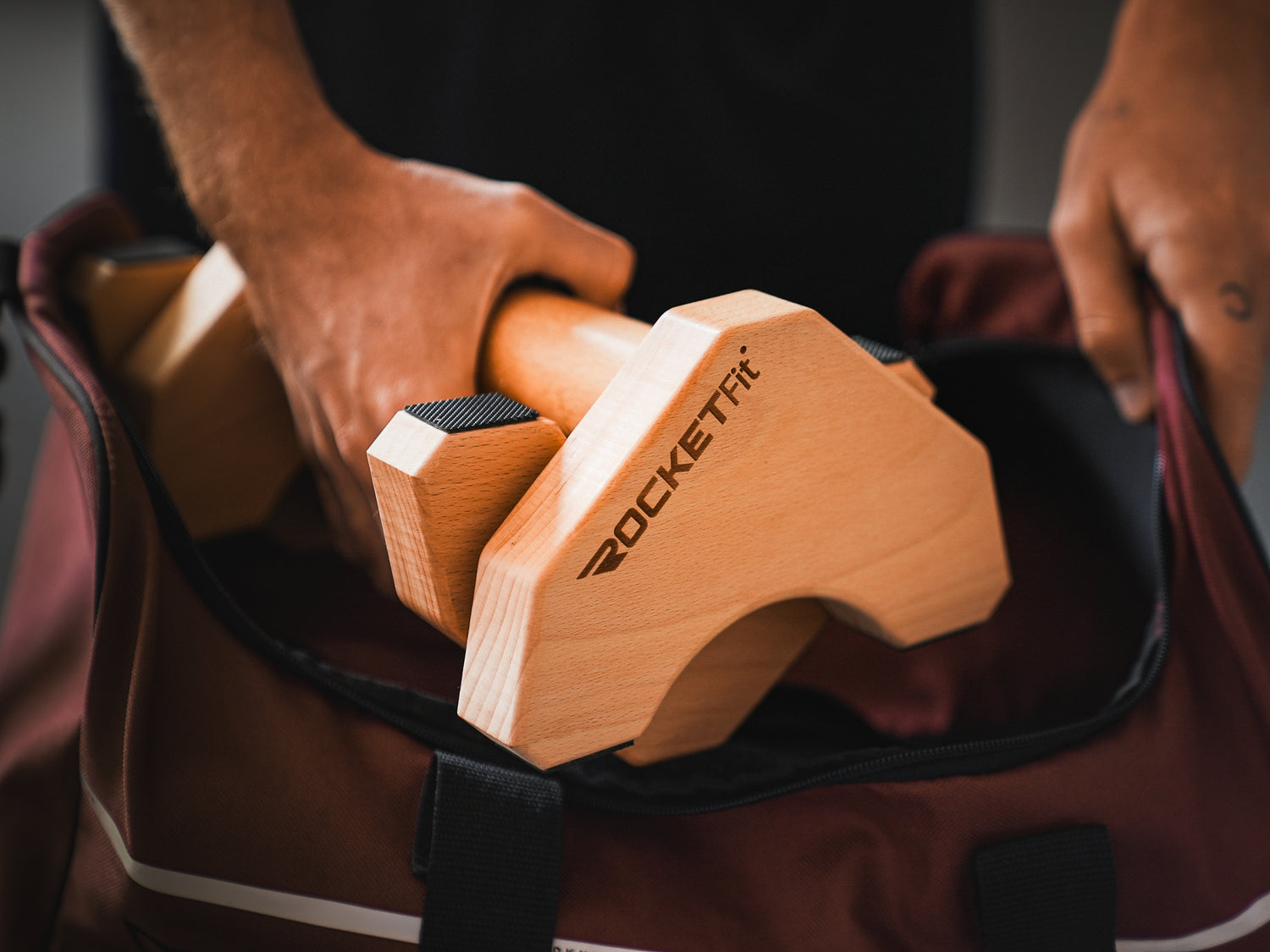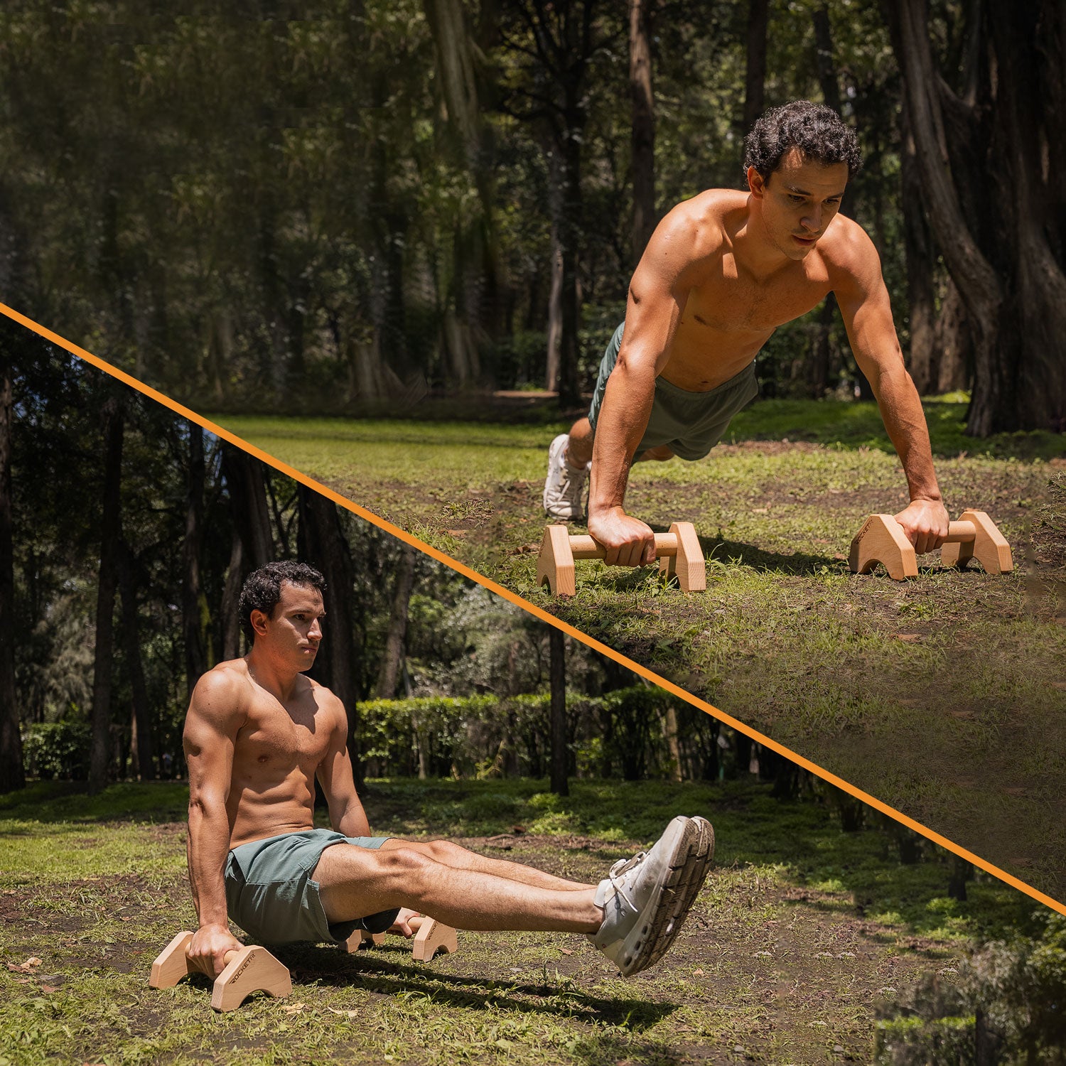 Mangos ergonómicos que se adaptan a la forma natural de tus manos, junto con dimensiones óptimas para diferentes tipos de ejercicios corporales: fondos, planchas, push-ups, L-sit, e incluso ejercicios más avanzados. Equilibrio perfecto entre altura, ancho y agarre.